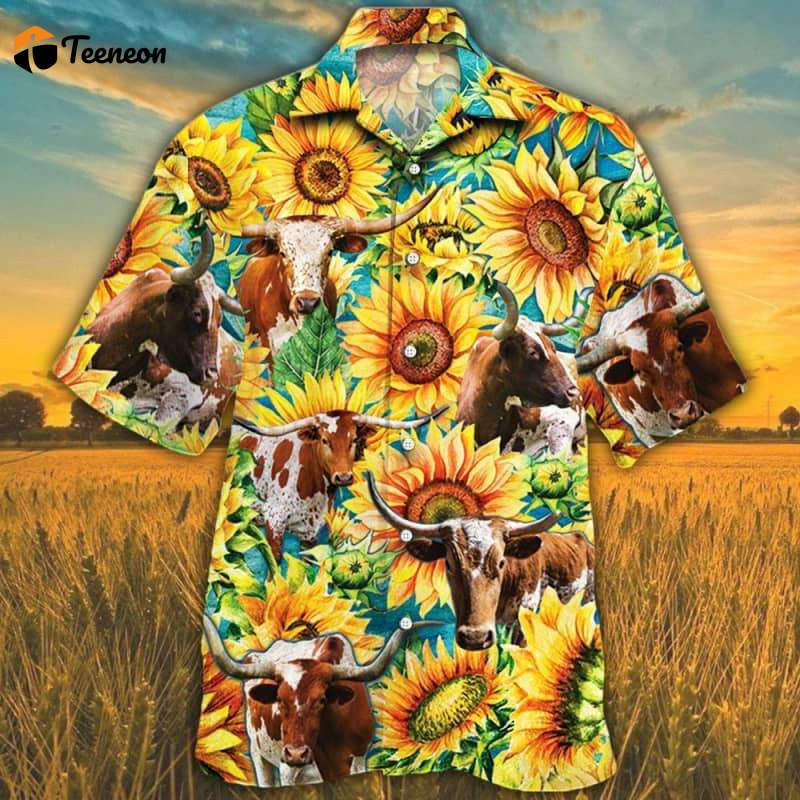Bobsgardens Sunflower TX Longhorn Cattle All Printed 3D Hawaiian Shirt